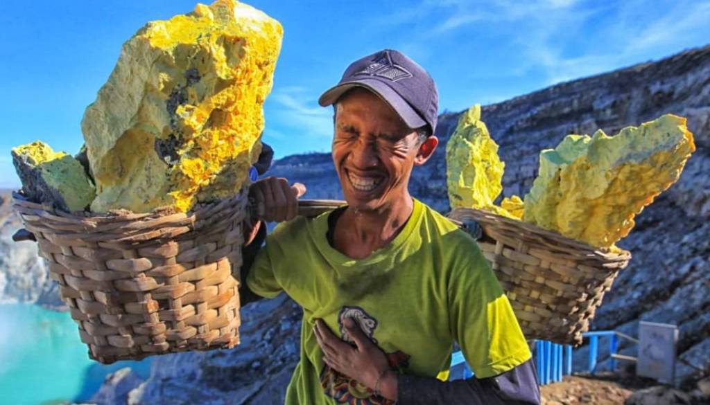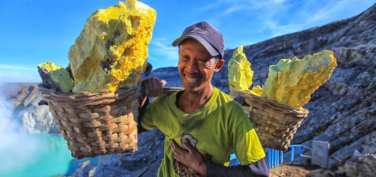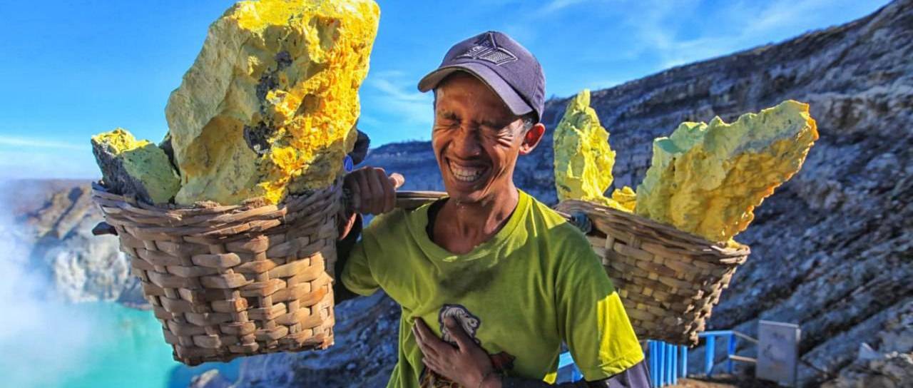 Prikazuje delavca, ki na vzhodu indonezijskega otoka Java v trstičnih košarah prenaša do 90 kilogramov težke kose žveplove rude. Dvakrat dnevno se poda na trikilometrsko pot po gori in se spusti 200 metrov globoko v osrčje vulkana, kjer nastajajo žveplovi kristali. Delo opravlja brez kakršnekoli zaščite, izpostavljen zadušljivi vročini in škodljivemu plinu.