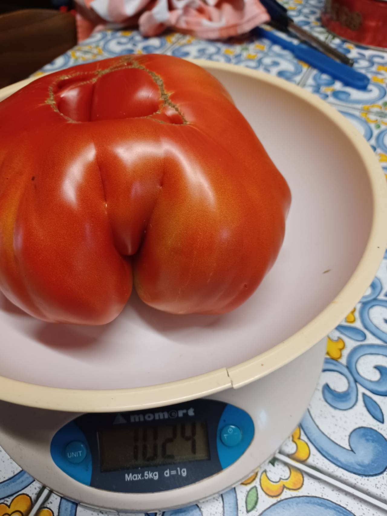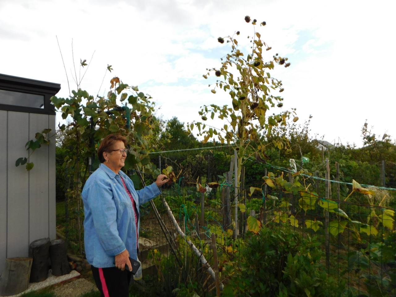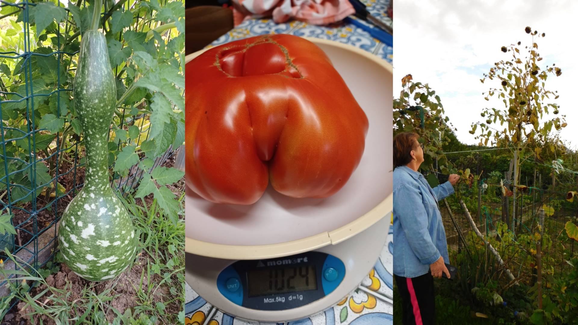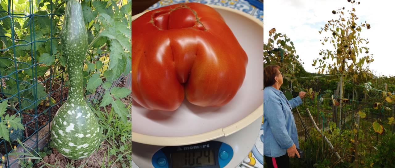 Kljub nestanovitemu vremenu ji je tudi tokrat uspelo pridelati kar nekaj osupljivih pridelkov, izstopajoč je predvsem paradižnik, ki je tehtal več kilogram.