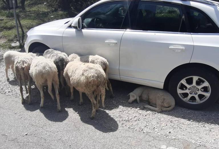 Pozornost enega od obiskovalcev so na Vršiču v zadnjih dneh pritegnile ovce, ki se stiskajo ob parkirane avtomobile.