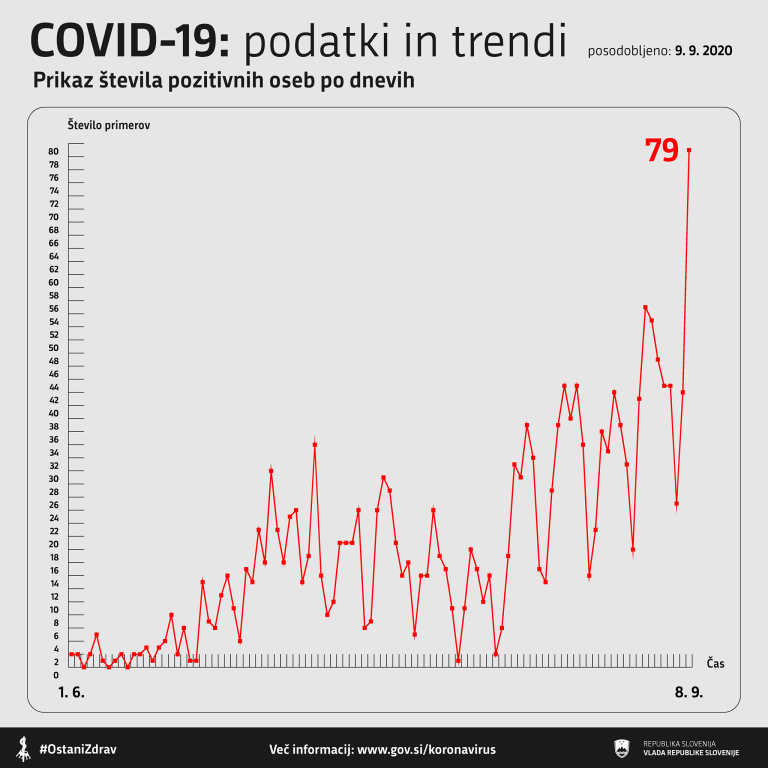 V Sloveniji so včeraj, 8. septembra, opravili 2560 testiranj na novi koronavirus. Potrdili so 79 novih okužb, kar je največ od začetka epidemije. Do zdaj je najvišje dnevno število okužb znašalo 61, in sicer 26. marca. Prav tako je bilo včeraj opravljenih tudi največ testiranj.