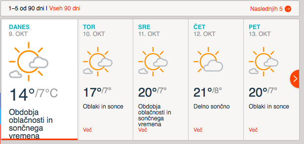 Danes zjutraj in dopoldne bo večinoma sončno, po nekaterih nižinah se bo zadrževala megla. Popoldne bo spremenljivo do pretežno oblačno, predvsem v zahodni in osrednji Sloveniji je možna kakšna kratkotrajna ploha. Najvišje dnevne temperature bodo od 14 do 18, na Primorskem do 21 stopinj C.
