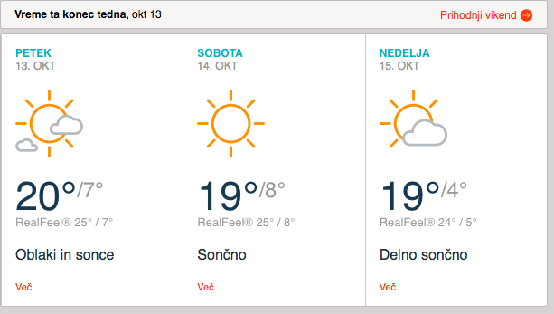 Tudi prihodnji konec tedna bo naklonjen aktivnemu preživljanju prostega časa in verjetno zadnji letos s tako visokimi temperaturami. Najvišje dnevne temperature se bodo gibale okoli 19 stopinj Celzija, medtem ko bodo jutra še zmeraj jesensko sveža.