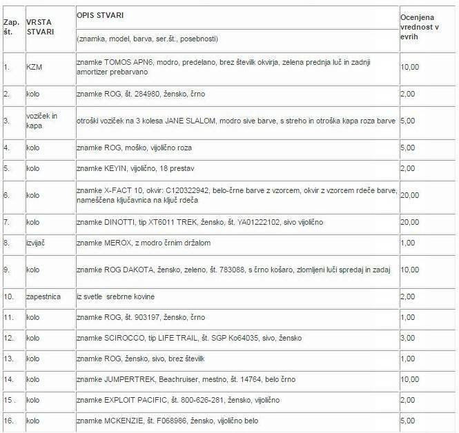 Naprodaj bodo različni predmeti po ugodnih cenah. Na primer izklicna cena kolesa je en evro, za moped deset evrov ter za otroški voziček in kapo pet evrov. Sicer si pa podrobne podatke predmetov lahko ogledate spodaj.