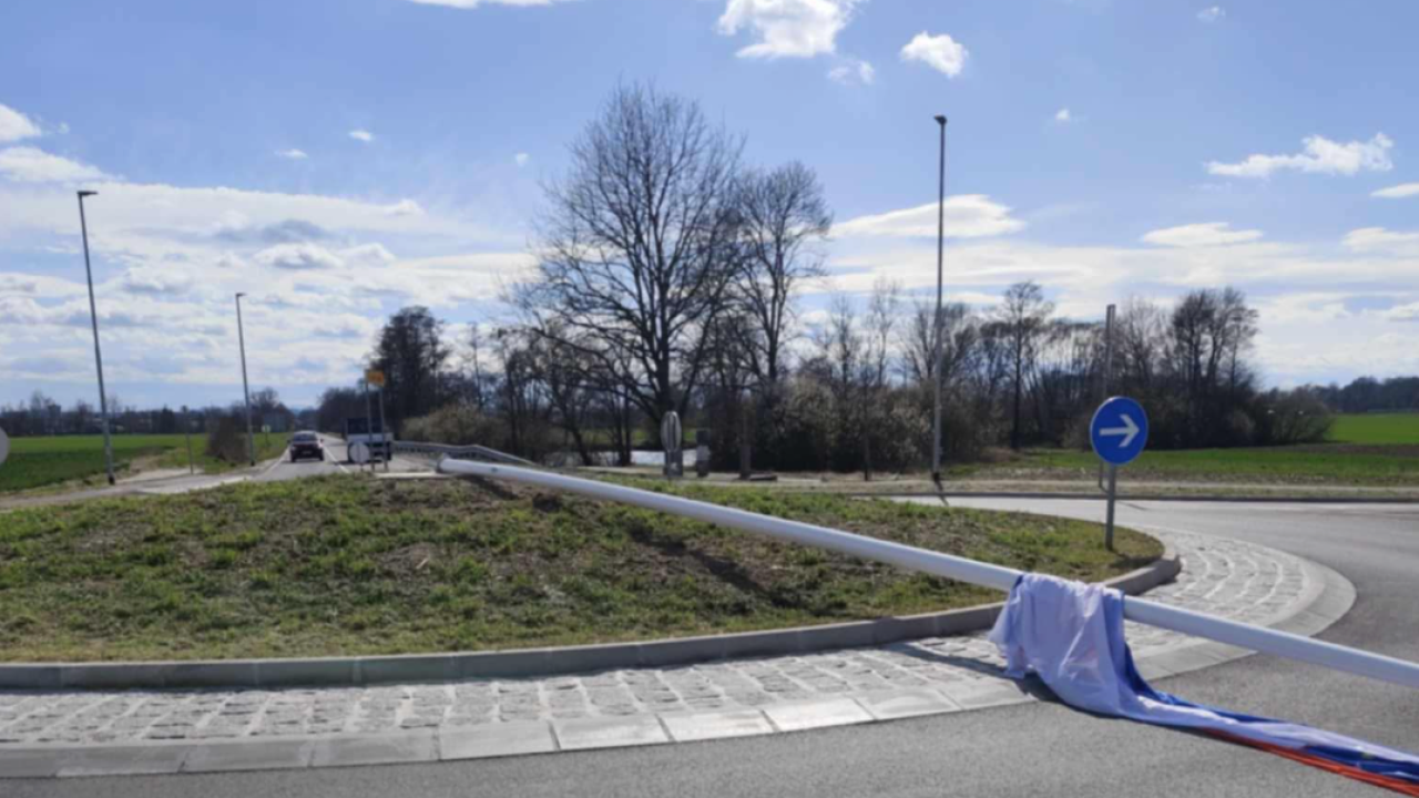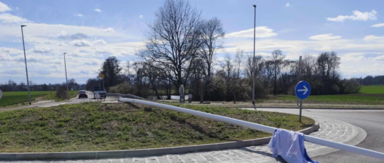 Močan veter je 22. marca, kot smo poročali, po manj kot mesecu dni od postavitve v novem krožišču v občini Črenšovci podrl 12-metrski drog s slovensko zastavo. Drog je bil strgan z navojev in je z zastavo vred obležal v krožišču.