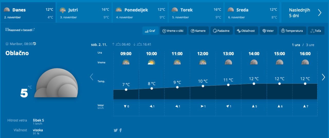 Pihal bo veter južnih smeri, ob morju jugo. Jutranje temperature bodo od 6 do 12, ob morju okoli 15, najvišje dnevne od 15 do 20, v alpskih dolinah okoli 12 stopinj Celzija.