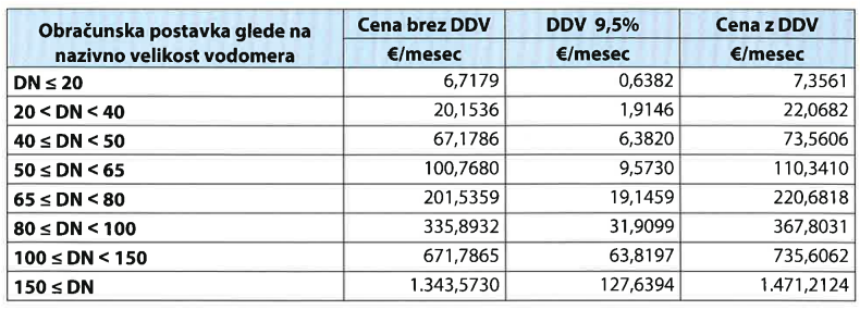 Cena omrežnine, ki se ne spreminja, znaša za vodovodni priključek 6,7179 evra na mesec brez davka na dodano vrednost.