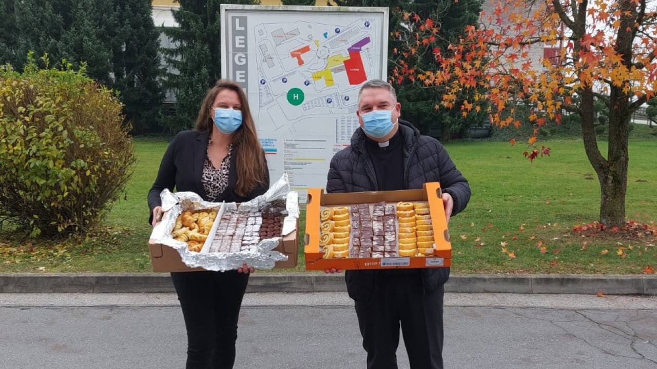Ob 30. obletnici Župnijske Karitas Ljutomer sta župnik župnije Ljutomer Goran Merica in duhovni pomočnik Izidor Veleberi murskosoboški bolnišnici predala pecivo za zaposlene.