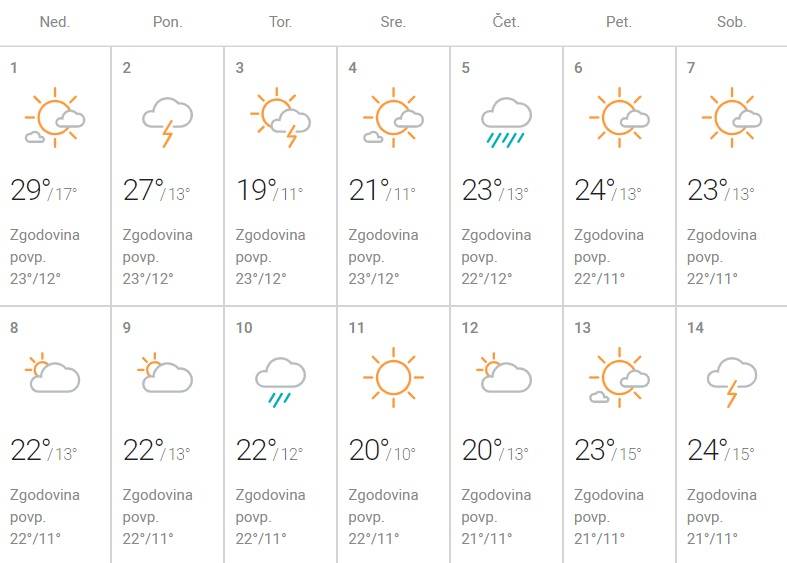 Po modelski napovedi meteorološkega portala Accuweather bodo ozračje v ponedeljek ohladile nevihte. Temperature se bodo spustile za več kot 10 stopinj in v torek čez dan napovedujejo največ 19 stopinj Celzija.