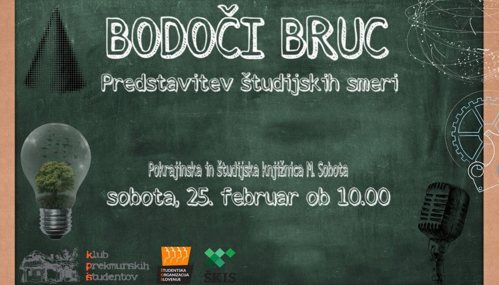Rok za vpis na študijske programe se nezadržno približuje. Prehod iz srednje šole na fakulteto je velika odločitev v življenju, česar se zavedajo tudi pri Klubu prekmurskih študentov, zato letos ponovno vabijo dijake na predstavitev študijskih smeri. Dogodek Bodoči bruc: predstavitev študijskih smeri bo potekal v soboto, 25. februarja 2017, v Pokrajinski in študijski knjižnici Murska Sobota, s pričetkom ob 10. uri.