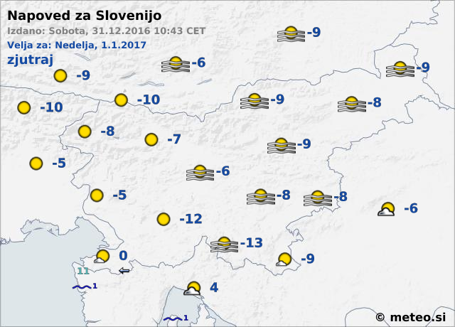 Vsi, ki boste novo leto pričakali zunaj, na prostem pa se dobro oblecite, saj kot napovedujejo vremenoslovci na Agenciji za okolje, bo silvestrska noč sicer jasna, a mrzla. Temperature se bodo gibale od – 10 pa do – 5, le na Primorskem bo morda kaj topleje.