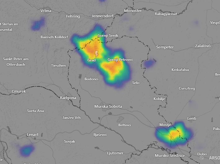 Nevihtna celica je nastala nad Gornjimi Petrovci in Gradom ter potuje v smeri proti Murski Soboti.