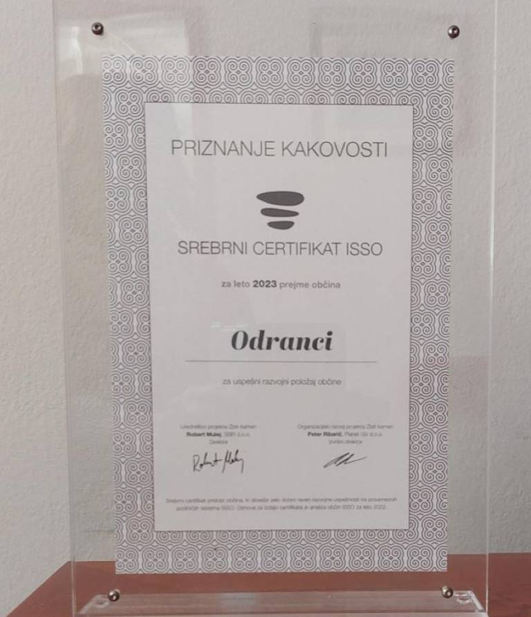 Občina Odranci je prejela srebrni certifikat ISSO za leto 2023 za uspešni razvojni položaj občine.