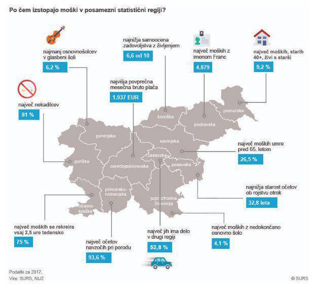 Tudi na Statističnem uradu Republike Slovenije so se ob tej priložnosti posvetili moškim in preverili, kaj nam statistični podatki povedo o razlikah med Slovenci na različnih koncih države.