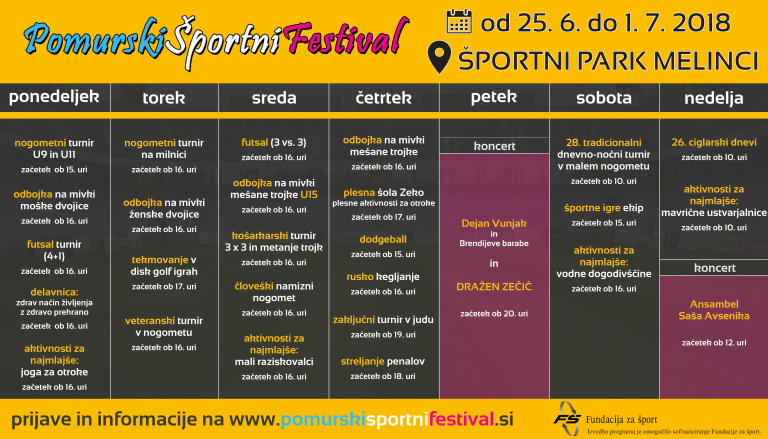 V zadnjem junijskem tednu, tik preden bomo skočili v dolgo poletje, se v športnem parku Melinci začenja največja športna prireditev v Pomurju. Pomurski športni festival letos spet obeta veliko športa, zabave in dobre glasbe. Od 25. junija do 1. julija se bo zvrstilo kar 20 športnih aktivnosti, 5 aktivnosti za otroke in dva koncerta. Izvedbo športnega programa pa letos omogoča tudi sofinanciranje Fundacije za šport.