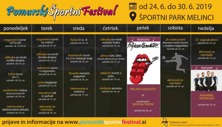 Po štirih športnih dneh bo petek koncertni dan. Na letošnjem velikem koncertu Pomurskega športnega festivala bo kot predskupina nastopila Skupina Tropik, nato pa sledi pravi rock spektakel s skupino Prljavo kazalište (vstopnina je 8 eur). Festivalsko dogajanje pa se bo v nedeljo zaključilo s 27. ciglarskimi dnevi, ki jih pripravlja Turistično društvo Brod Melinci, in nastopom Ansambla Modrijani (vstopnine ni).
