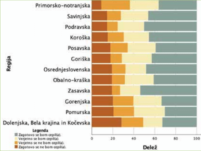 Cepljenju so sicer najbolj naklonjeni zdravstveni delavci v podravski regiji, kjer jih je 75 odstotkov odgovorilo, da se bodo verjetno ali zagotovo cepili. Cepljenju naklonjeni regiji sta tudi zasavska, kjer jih je navedena odgovora izbralo 73 odstotkov, in savinjska z 72 odstotki.