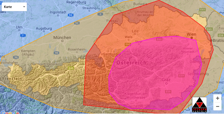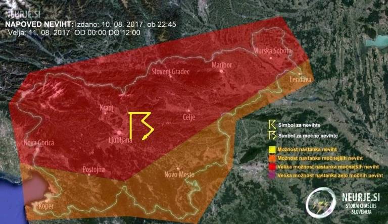 Avstrijska organizacija Skywarn Austria - Unwetter & Wettermeldungen za naše kraje spet napoveduje možnost močnih neviht ob katerih bodo možni močnejši nalivi, močni sunki vetra ter toča.