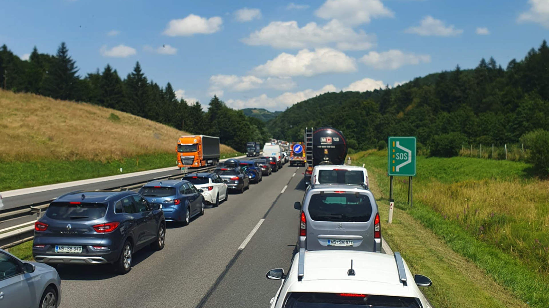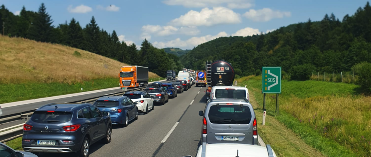 Desetkilometrski zastoj je pred predorom Karavanke proti Avstriji, prometnoinformacijski center priporoča izvoz Lesce in prelaz Korensko sedlo.