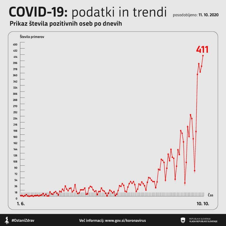 Z Vlade Republike Slovenije so sporočili sveže podatke o trendu obolelosti s koronavirusom v Sloveniji. Delež pozitivnih testov je najvišji doslej, in sicer 13,9 odstotka. Ob 2956 testiranjih je potrjenih 411 primerov covida-19.