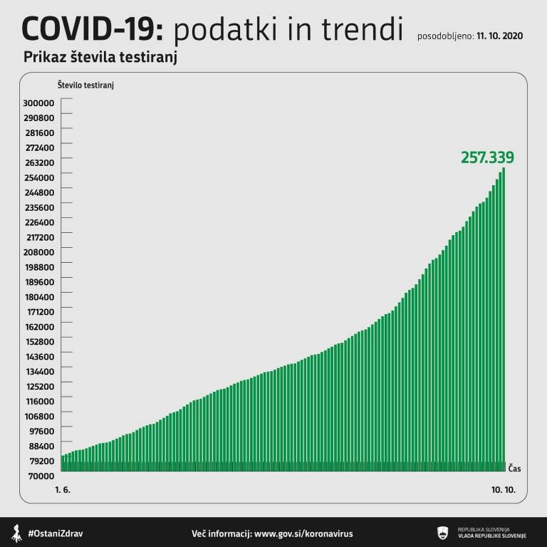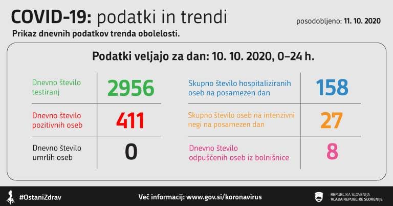 V Sloveniji so včeraj, 10. oktobra, opravili 2956 testiranj na koronavirus. Potrdili so 411 novih okužb.
