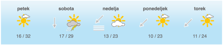 Najvišje dnevne temperature bodo od 29 do 34 stopinj Celzija. Tudi ponoči bo še precej jasno. Jutranje temperature bodo od 13 do 18 stopinj Celzija.
