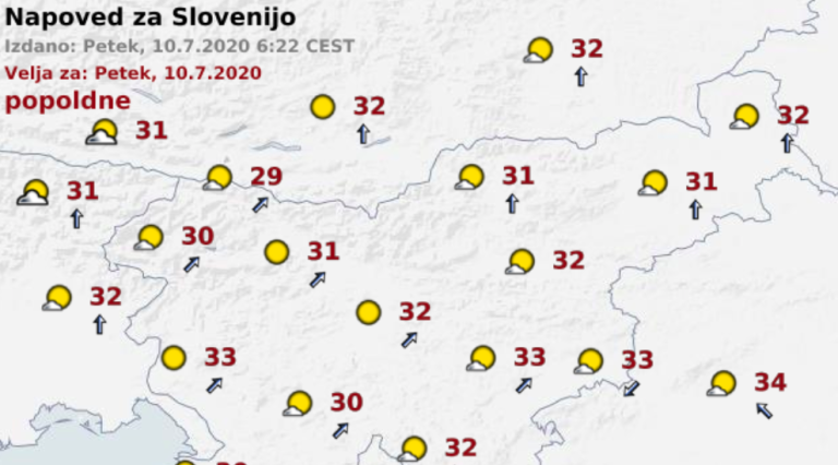 Najvišje dnevne temperature bodo od 25 do 30, na jugovzhodu do 32 stopinj Celzija. Do nedelje zjutraj se bo razjasnilo, po kotlinah bo nastalo nekaj megle.