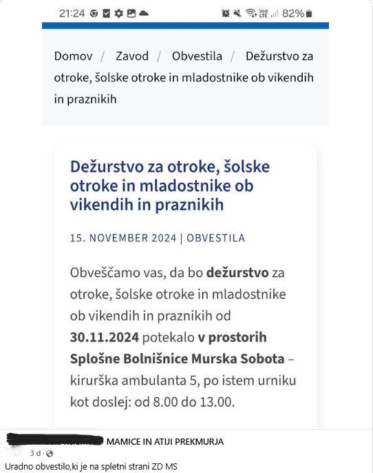 V zadnjih dneh so se na družbenem omrežju Facebook razširile napačne informacije, da bo dežurstvo za otroke, šolske otroke in mladostnike ob koncih tedna in praznikih od 30. novembra 2024 potekalo v prostorih Splošne bolnišnice Murska Sobota in ne v soboškem zdravstvenem domu.