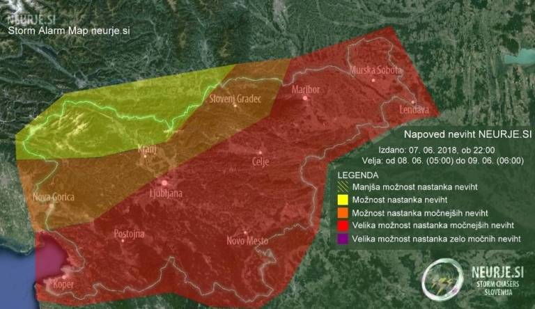 Predvsem na jugu, vzhodu in severovzhodu države bi torej popoldan, zvečer in v noči na soboto lahko nastajala krajevna neurja s silovitimi sunki vetra, močnimi nalivi in točo. Razvoj neviht, ki bodo lahko zajela širša območja, bo predvidoma intenziven, popoldan in zvečer pa svarijo tudi pred debelejšo točo.