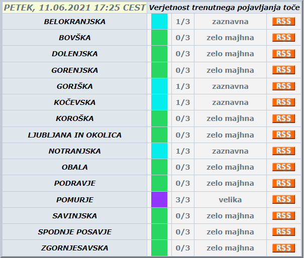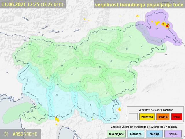 Agencija Republike Slovenije za okolje je za Pomurje izdala vijoličast alarm za nevarnost trenutnega pojavljanja toče.