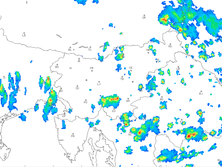 S severovzhoda se nad naše kraje pomika nevihtna celica. Po napovedih vremenoslovcev bodo popoldne nastajale krajevne plohe in posamezne nevihte. Pihal bo veter severnih smeri, ki bo najbolj občuten na severu in vzhodu Slovenije.