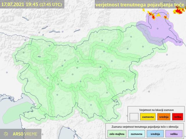 Podobno kaže tudi opozorilo Agencije Republike Slovenije za okolje, ki za Prekmurje trenutno napoveduje zelo veliko verjetnost toče.