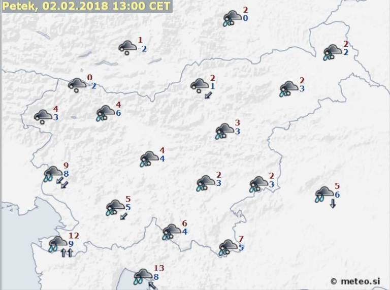 Danes je bilo sicer povečini oblačno, predvsem ponekod na Primorskem tudi megleno. Predvsem v zahodni, južni in delu osrednje Slovenije so bile tudi občasne padavine.
