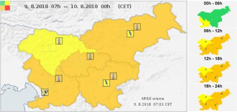Danes bo po večini sončno, popoldne je možna kakšna vročinska nevihta, napovedujejo vremenoslovci. Pihal bo po večini šibak veter južnih smeri, najvišje temperature pa bodo dosegle 35 stopinj Celzija. Zaradi velike vročine je Agencija Republike Slovenije za okolje izdala oranžni alarm za večji del države.