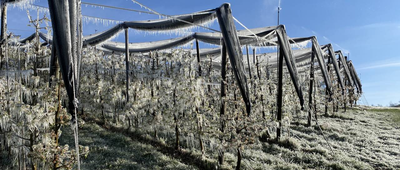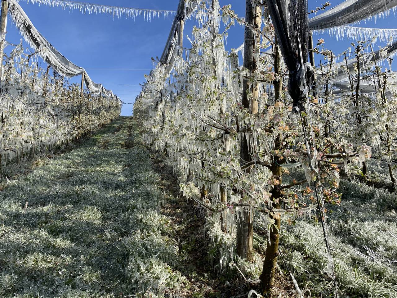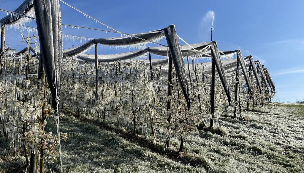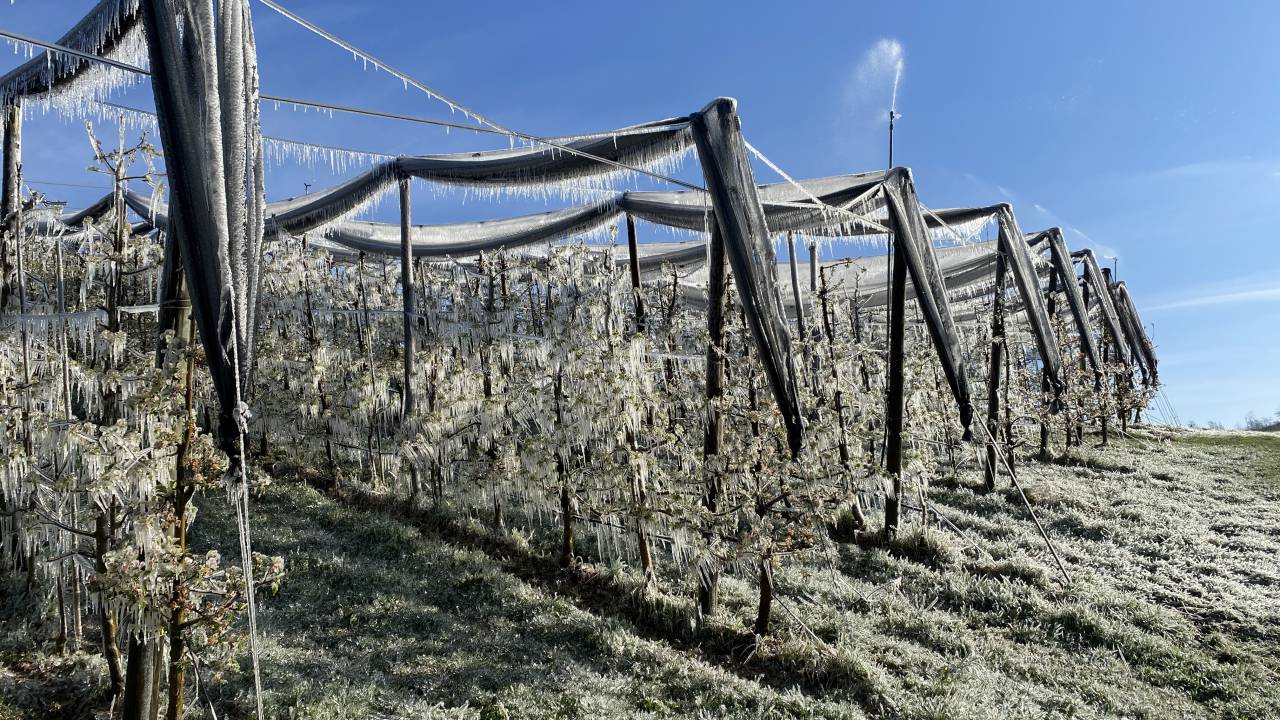»Ko voda prehaja iz tekoče faze v trdno fazo, se pravi v led, se sprošča energija. Ta energija potem nekje v nasadu ostane in potem je znotraj ledu vedno temperatura okrog ničle ali pa malo pod ničlo, in to ščiti,« pojasni Miran Torič, specialist za vinogradništvo in sadjarstvo na Kmetijsko gozdarskem zavodu Murska Sobota.