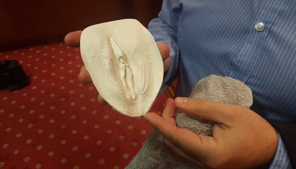Umetnik nam je pojasnil tudi postopek izdelave odlitka vagine. Odlitki nastanejo s pomočjo silikonske zmesi, ki se v nekaj minutah strdi, nato pa se sama oblika še utrdi z mavčnimi povoji. Modeli morajo biti depilirani, saj če ne bi bile bi bilo odstavnjevanje zelo boleče. Za popolno utrjenost in kvaliteto odlitka je vsak model moral imeti na sebi 30 minut.