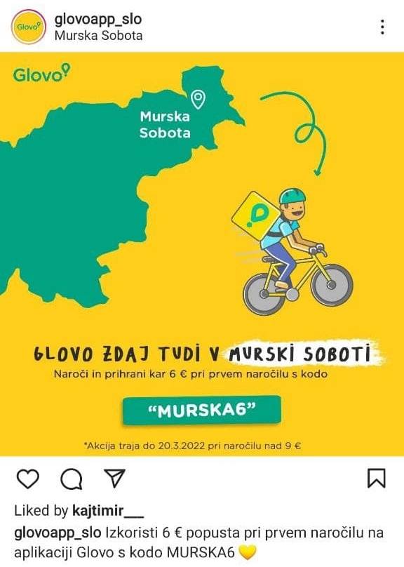 »Prebivalci Murske Sobote lahko zdaj z aplikacijo hitre dostave (Glovo) kupujejo, prejemajo ali pošiljajo kateri koli izdelek. S to uvedbo je storitev Glovo postala na voljo v 26 mestih po Sloveniji in še naprej uresničuje obljubo, da bo s partnerstvi z lokalnimi podjetji čim bližje strankam po vsej državi ter pokriva širok nabor izdelkov,« so povedali za Sobotainfo.