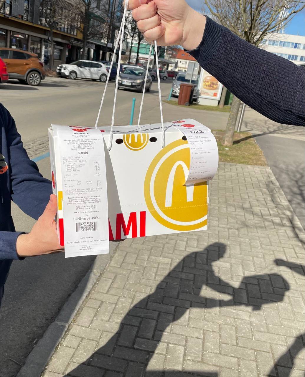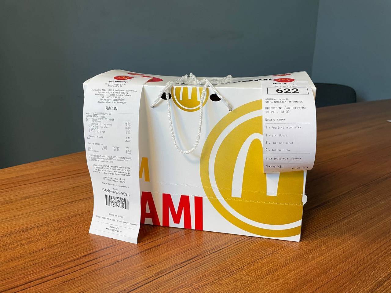 Naročili smo hrano iz McDonald's Murska Sobota, čas dostave je bil približno 20 minut. V aplikaciji so nas obvestili o tem, da je restavracija prejela naše naročilo ter, da ga je dostavljalec prevzel. Njegovo pot smo lahko ves čas dostave tudi spremljali. Cena dostave je bila 1,50 evra, se pa cena razlikuje od ponudnika do ponudnika.