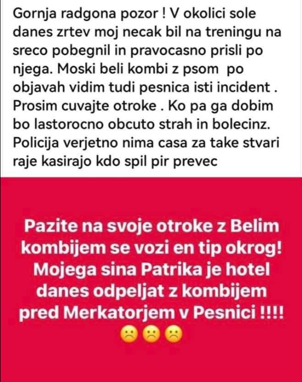 Nekateri starši so navajali, da naj bi moški s psom in belim kombijem v sredo, 14. decembra, poskušal ugrabiti otroka, ki je zapuščal trening.