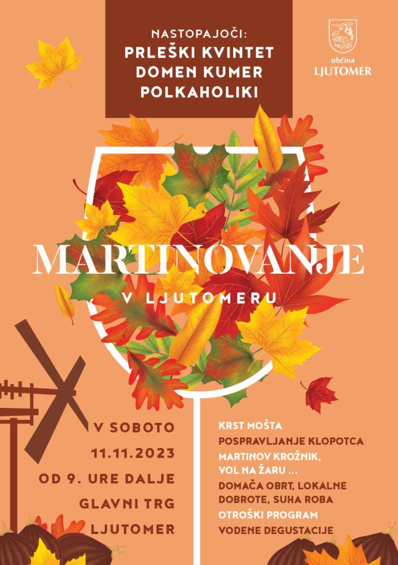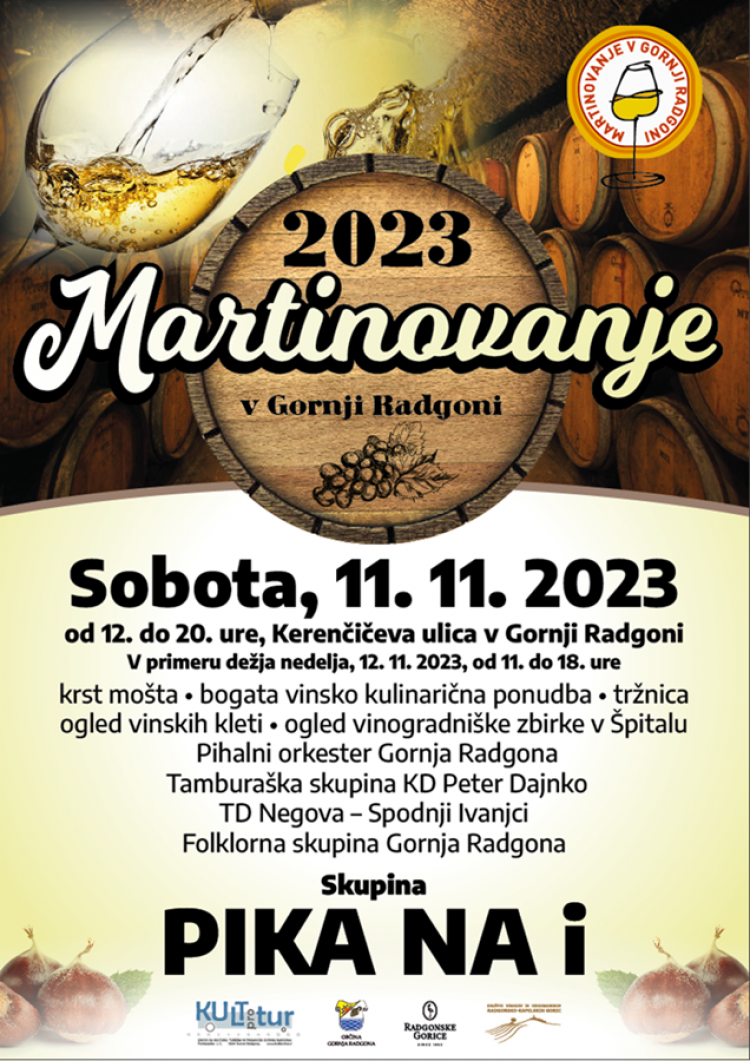 V soboto, 11. novembra, bo potekalo osrednje martinovanje, ki se bo začelo zjutraj, ob 10. uri, z Martinovim pohodom, nadaljevalo pa ob 11. uri pri Hotelu Cubis, kjer bo potekal Martinov sejem, krst mošta, od 16. ure naprej pa glasbena zabava s skupino Blue Planet.