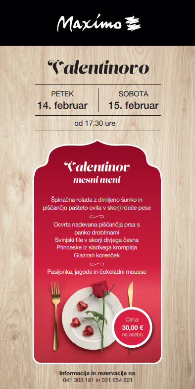 Valentinov meni v Restavraciji Maximo si lahko ogledate na spodnji fotografiji, cena menija pa bo 30 evrov na osebo.