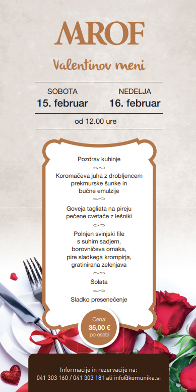 Valentinov meni v Domačiji Marof si lahko ogledate na spodnji fotografiji, cena menija pa bo 35 evrov na osebo.