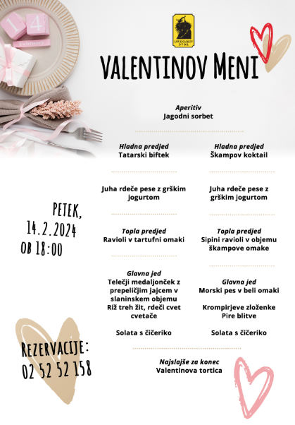 Valentinov meni bo na voljo v petek, 14. februarja, in v soboto, 15. februarja.
