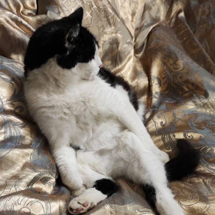 Mačka ima bel trebuh, rep in hrbet pa sta črna. Tudi območje okoli ušes in oči je črno obarvano. Gobček in nosek sta bele barve, slednjega pa krasi črna pika.