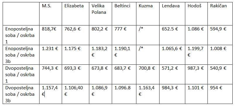 *V Domu starejših v Kuzmi nudijo samo dvoposteljne sobe, cene so izračunane za mesec, ki ima 30 dni, možna so odstopanja v ostalih mesecih.