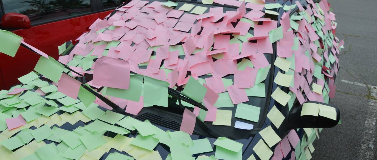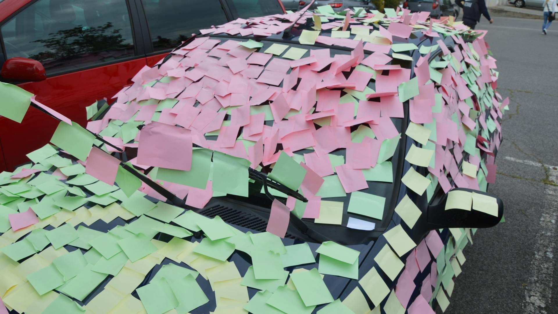Kot smo že poročali na Sobotainfo, so dijaki 4. B letnika ob slovesu od srednješolski dni hudomušno zagodli profesorici Gimnazije Murska Sobota Ireni Horvat. Avtomobil so ji namreč polepili z več kot 500 samolepilnimi lističi. Profesorica ni bila jezna, ravno nasprotno, presenečenje jo je razveselilo.