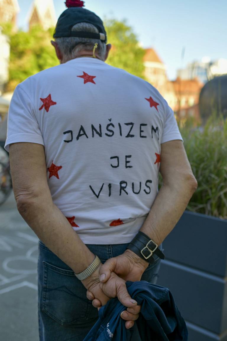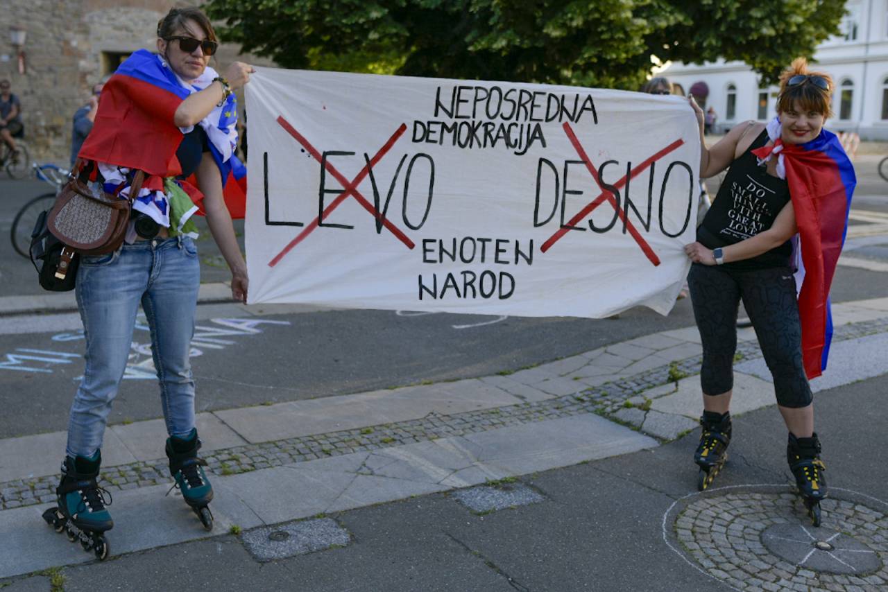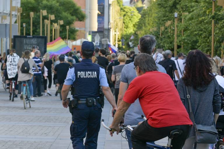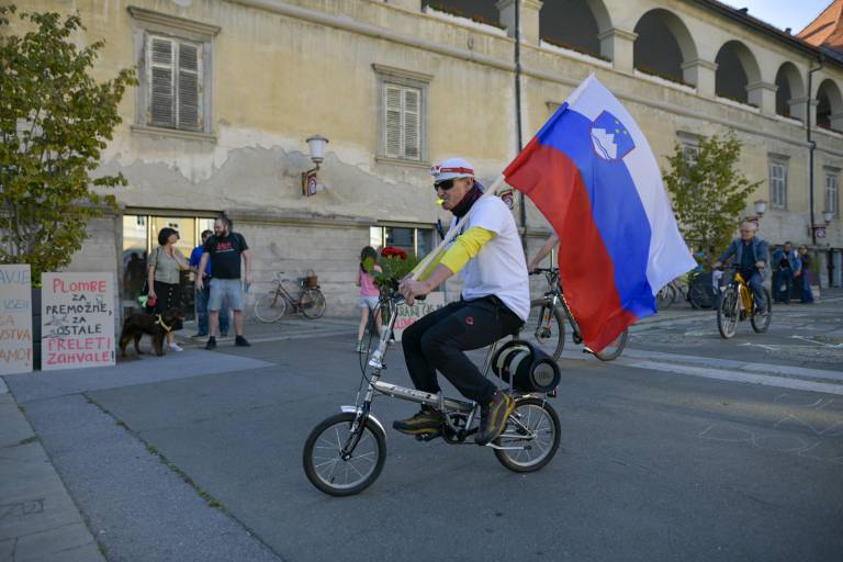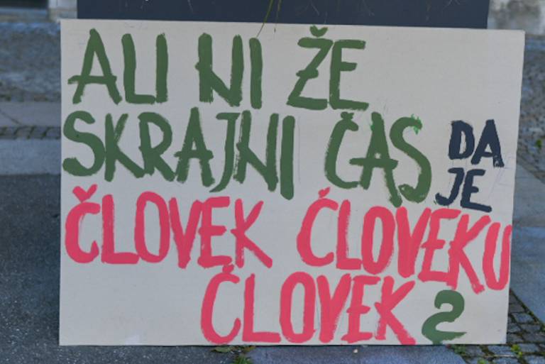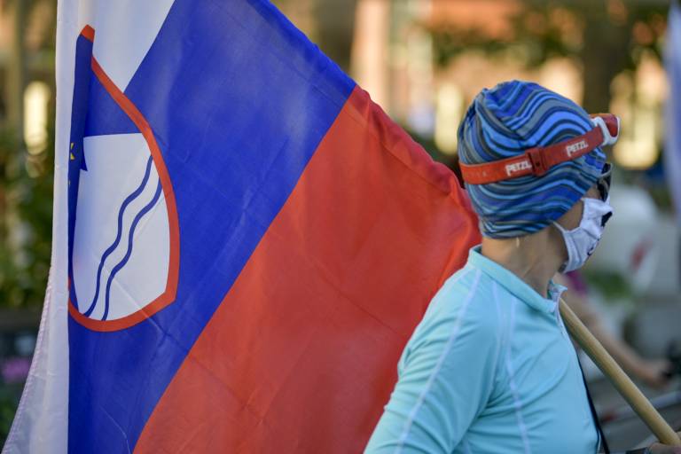 Na sredini trga, kjer na vsakem protestu z drugačno zastavo protestira mariborski umetnik in aktivist Renato Volker, je tokrat plapolala slovenska in mavrična zastava.