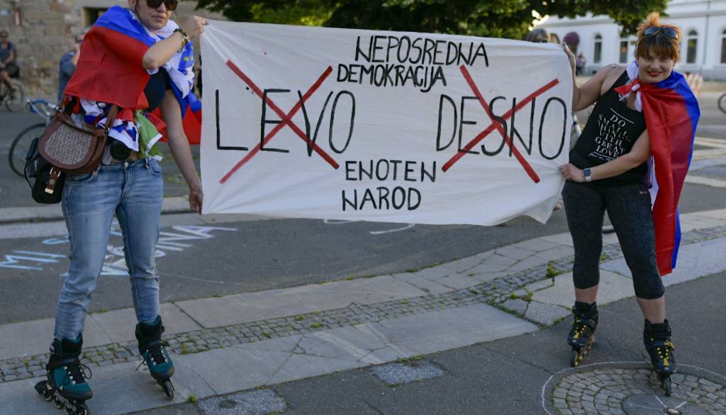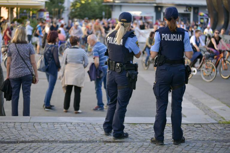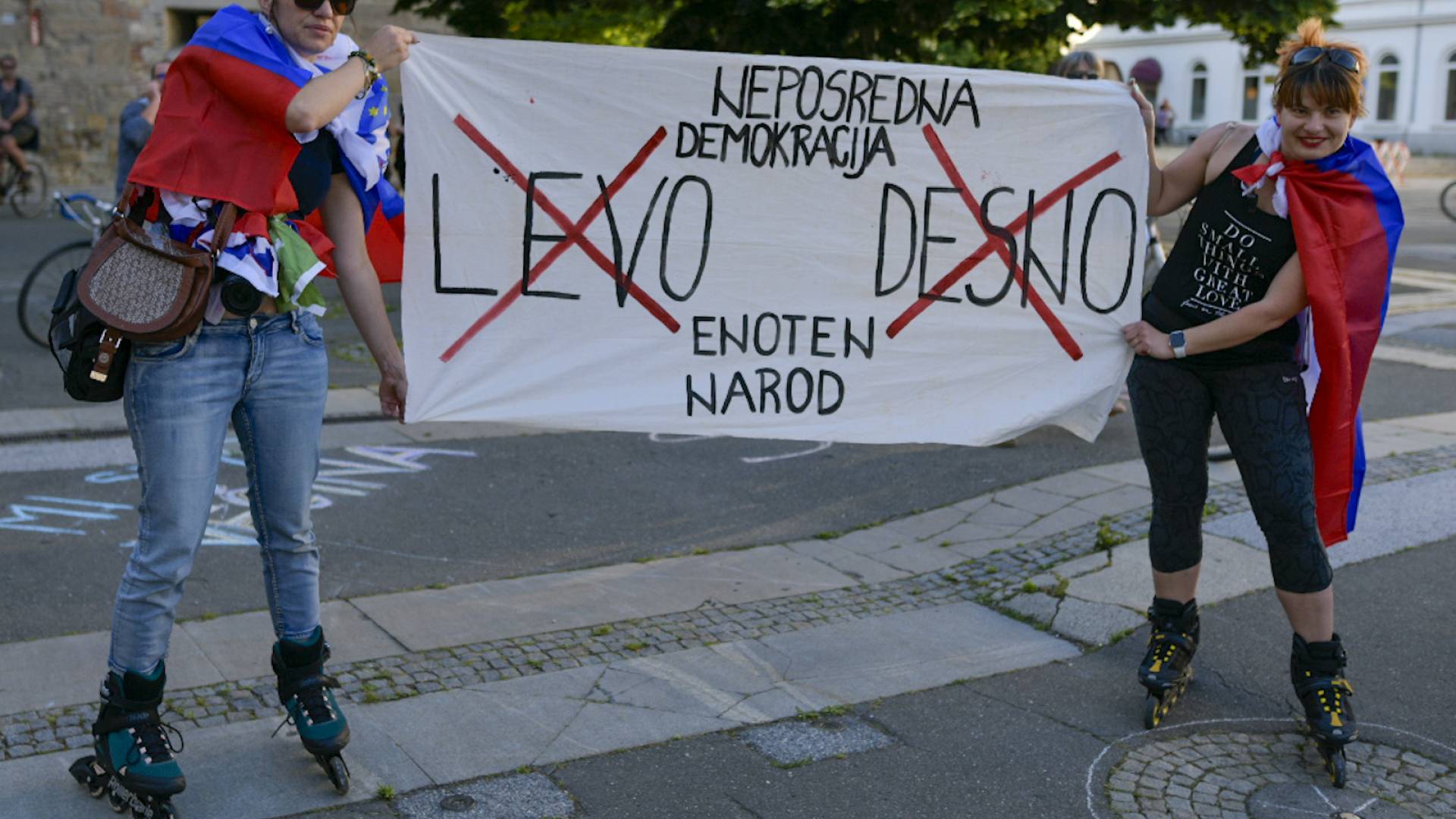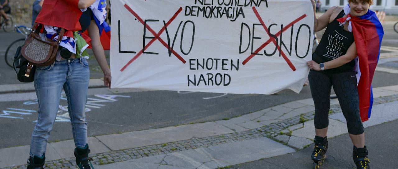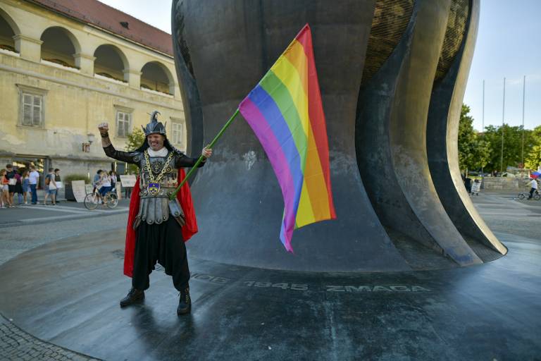 Na sredini trga, kjer na vsakem protestu z drugačno zastavo protestira mariborski umetnik in aktivist Renato Volker, je tokrat plapolala slovenska in mavrična zastava.