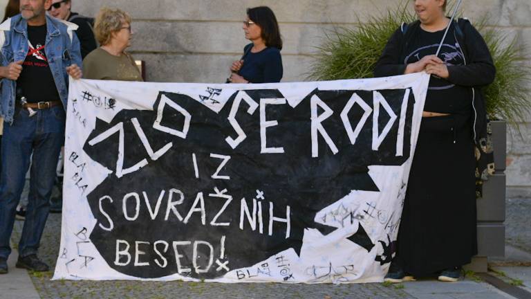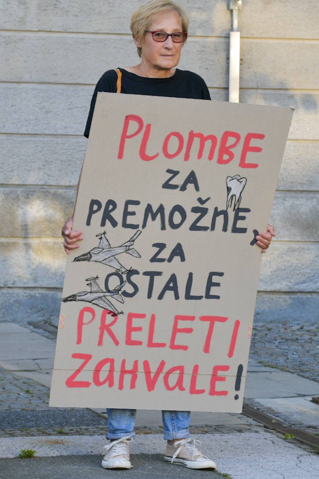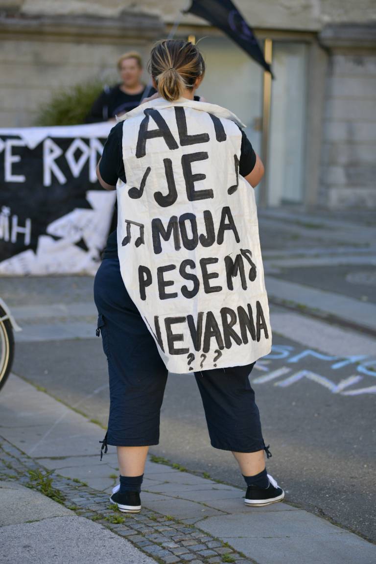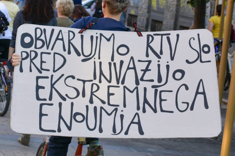 Protestniki so nase opozarjali z glasnimi trobljami, ragljami in hupami, številni so prinesli tudi transparente. Na njih smo lahko prebrali zapise »Zlo se rodi iz sovražnih besed«, »Obvarujmo RTV SLO pred invazijo ekstremnega enoumja«, »Plombe za premožne, za ostale preleti zahvale«.
