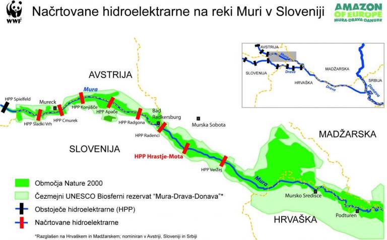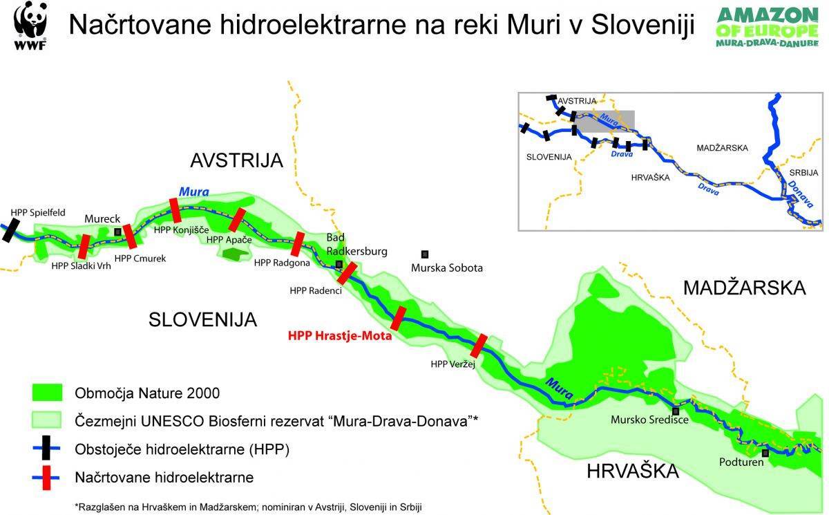 Slovenska energetska družba Dravske elektrarne (DEM) načrtuje spremembo reke Mure v verigo osmih hidroelektrarn, predvidena vrednost naložbe je 800 milijonov evrov. Prvih šest pregrad je načrtovanih ob avstrijsko-slovenski meji med Špiljem (Spielfeldom) in Radenci ter dodatni dve na območju Slovenije med Radenci in hrvaško mejo. Že v letu 2005 je slovenska vlada podelila DEM koncesijo za gradnjo načrtovanih osmih hidroelektrarn.