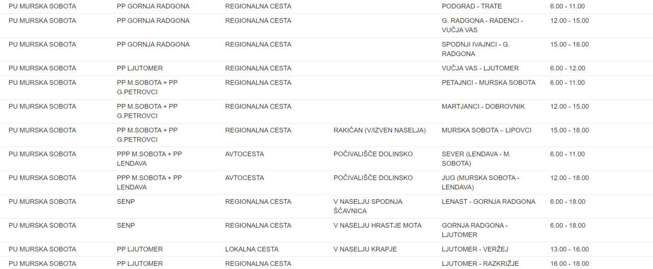 To je seznam lokacij na območju Policijske uprave Murska Sobota, kjer bodo policisti merili hitrost: